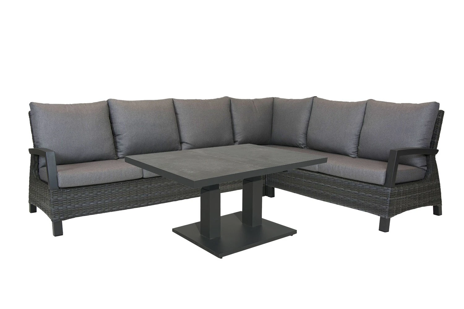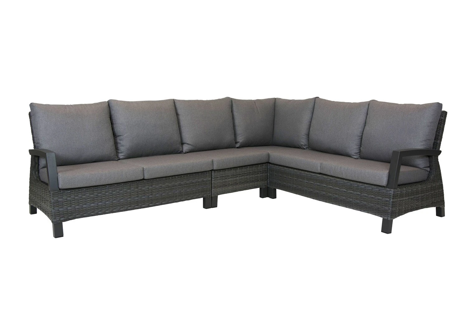 Met deze prachtige hoekbank uit de LISSABON serie van Royal Seasons kun je eindeloos genieten in de tuin. De hoekbank bestaat uit hoogwaardig wicker met een antraciet afwerking. Het aluminium frame is licht in gewicht, erg sterk en gemakkelijk in onderhoud. Daarom wordt aluminium veel gebruikt in de productie van tuinmeubelen. Deze hoekbank is een echte musthave voor op jouw terras!